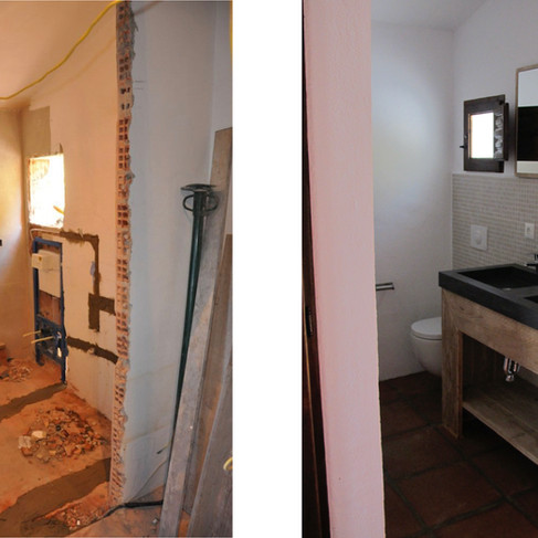 Next to the office was a large storage space, accessible only from outside the house. By carrying out some strategic demolition work, we divided this storage room in two. One half remained storage, while the other half was integrated into the former office to create a compact yet fully functional bathroom.